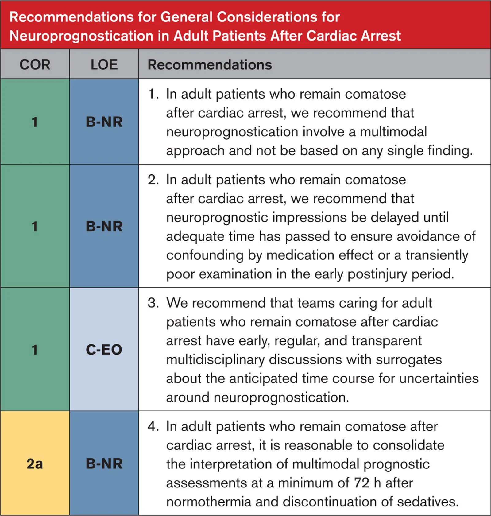 Avoid early prognostication. Formal neurologic prognostication should occur ≥72 hours after ROSC and after rewarming (If TTM used), with sedatives and paralytics cleared.